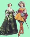 Кавалерист одет в безрукавку из буйволовой кожи, которую часто называют кожаной курткой. Безрукавка достаточно плотно облегает корпус, линия талии завышена, а полы закрывают бедра. Вокруг круглой горловины широкий кружевной отложной воротник. Безрукавка застегнута сверху донизу на ряд пуговиц с воздушными петлями. К узкому "крылышку"-ранту у плеча пришит рукав из мягкого материала. Рукава заканчиваются кружевными манжетами такого же типа, как и воротник. Широкие, до колена, штаны заканчиваются подвязками из лент. Гамаши отделаны кружевами, которые видны сверху мягких кожаных сапог. Талию охватывает широкий пояс, завязанный над левым бедром огромным бантом. В петлю перевязи вставлен меч. Шляпу в "кавалерийском" стиле со средней высоты тульей и очень широкими полями обычно заламывали назад и набок.